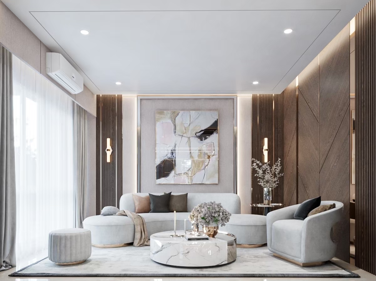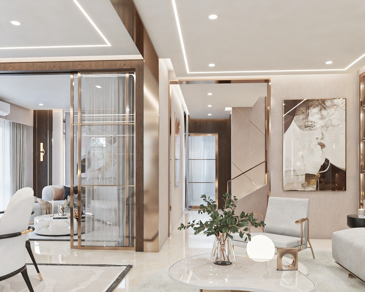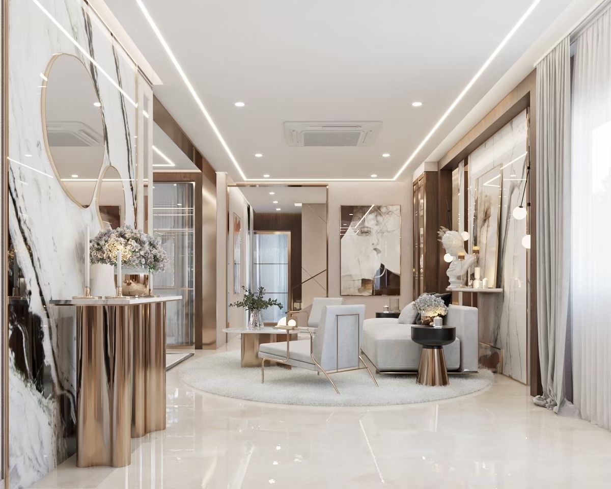 เฟอร์นิเจอร์: เลือกเฟอร์นิเจอร์ที่มีดีไซน์เรียบหรู เช่น โซฟาหนังที่มีสีขาวและสีทอง โต๊ะกระจกที่มีขอบโลหะเคลือบเงา การจัดวางเฟอร์นิเจอร์ให้ดูโปร่งและหรูหรา โดยเน้นการใช้งานที่สะดวกสบาย