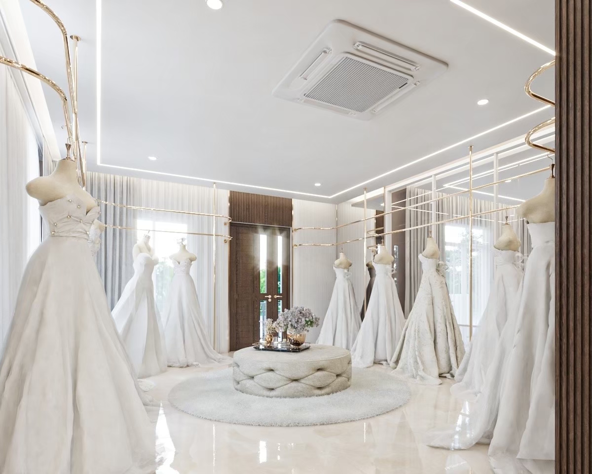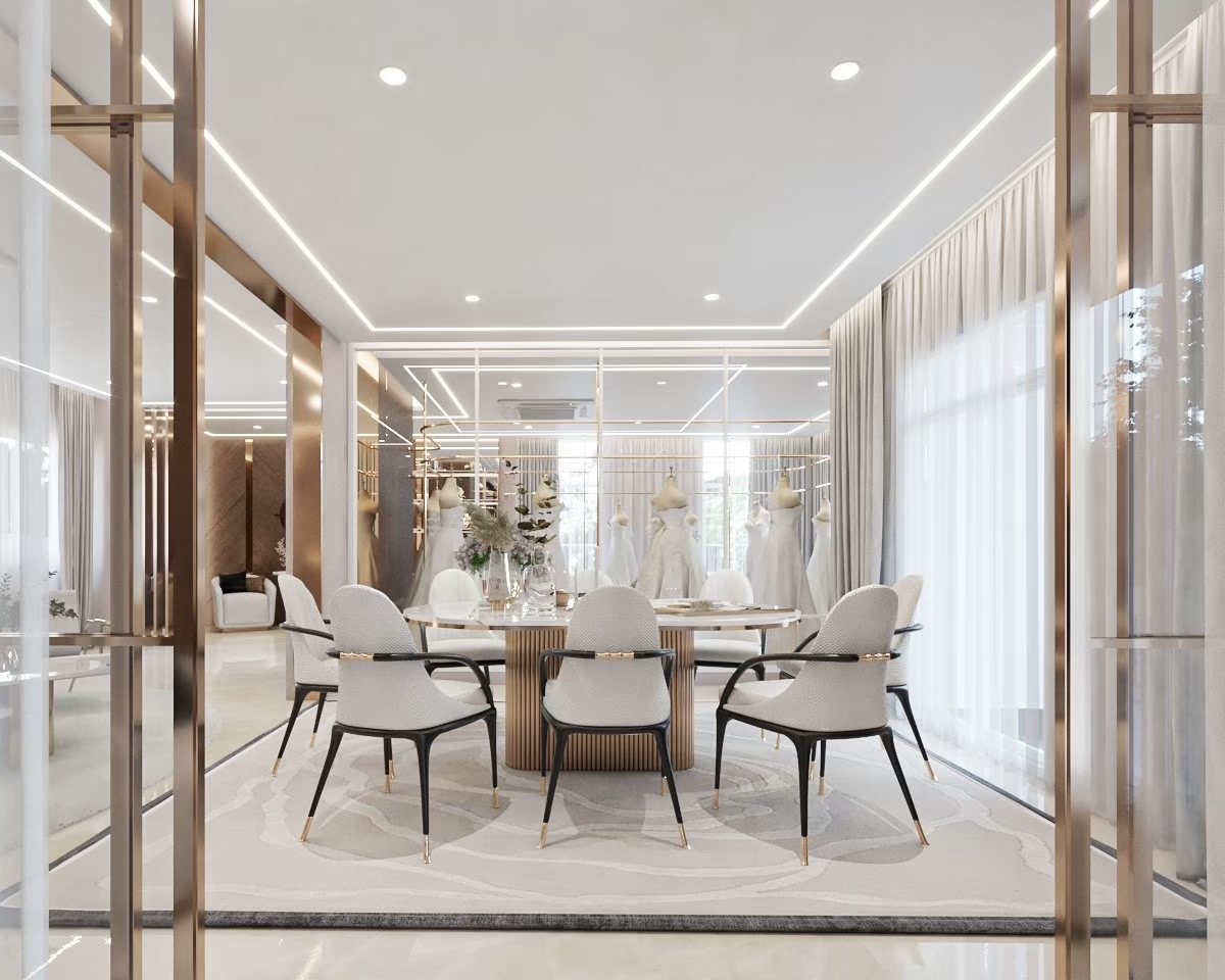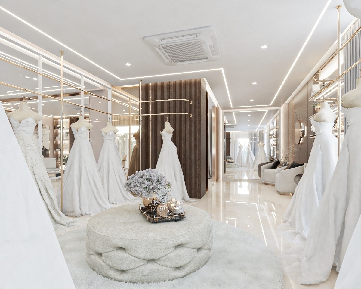 โครงการนี้เป็นการออกแบบและตกแต่งภายในร้านขายชุดแต่งงานในย่านพัฒนาการ กรุงเทพฯ โดยออกแบบในสไตล์ Modern Luxury เน้นความหรูหราและความเรียบหรู ในพื้นที่ 115 ตารางเมตร โดยใช้วัสดุที่มีคุณภาพสูงและสีโทนที่สร้างบรรยากาศที่หรูหรา เช่น สีทอง สีขาว และสีดำ เพื่อสร้างความประทับใจให้กับลูกค้าที่มาใช้บริการ