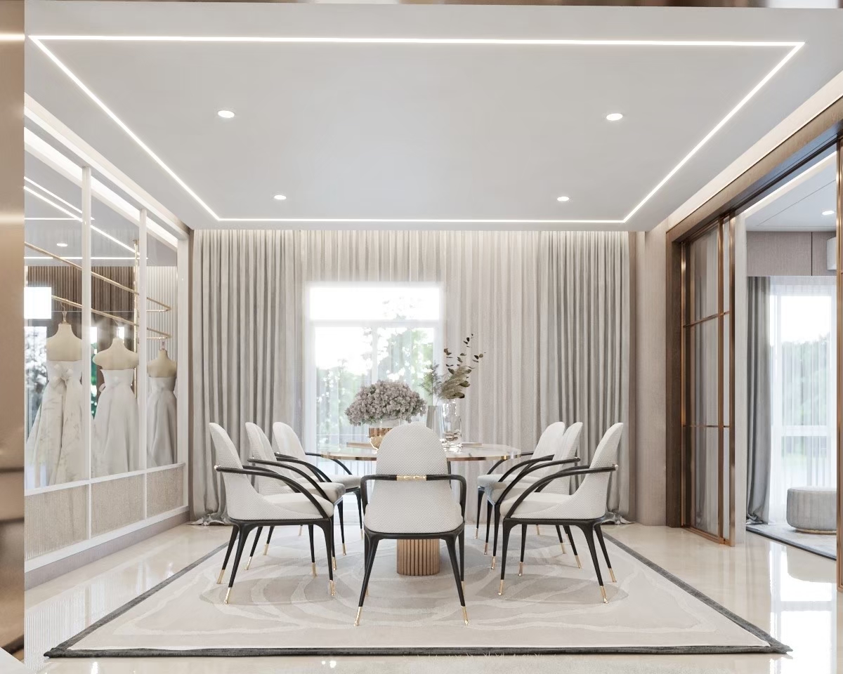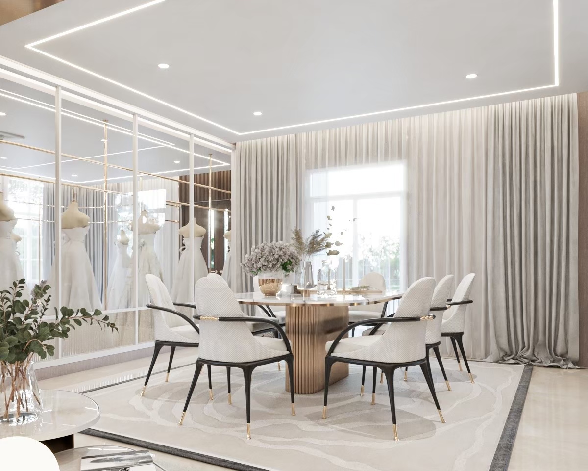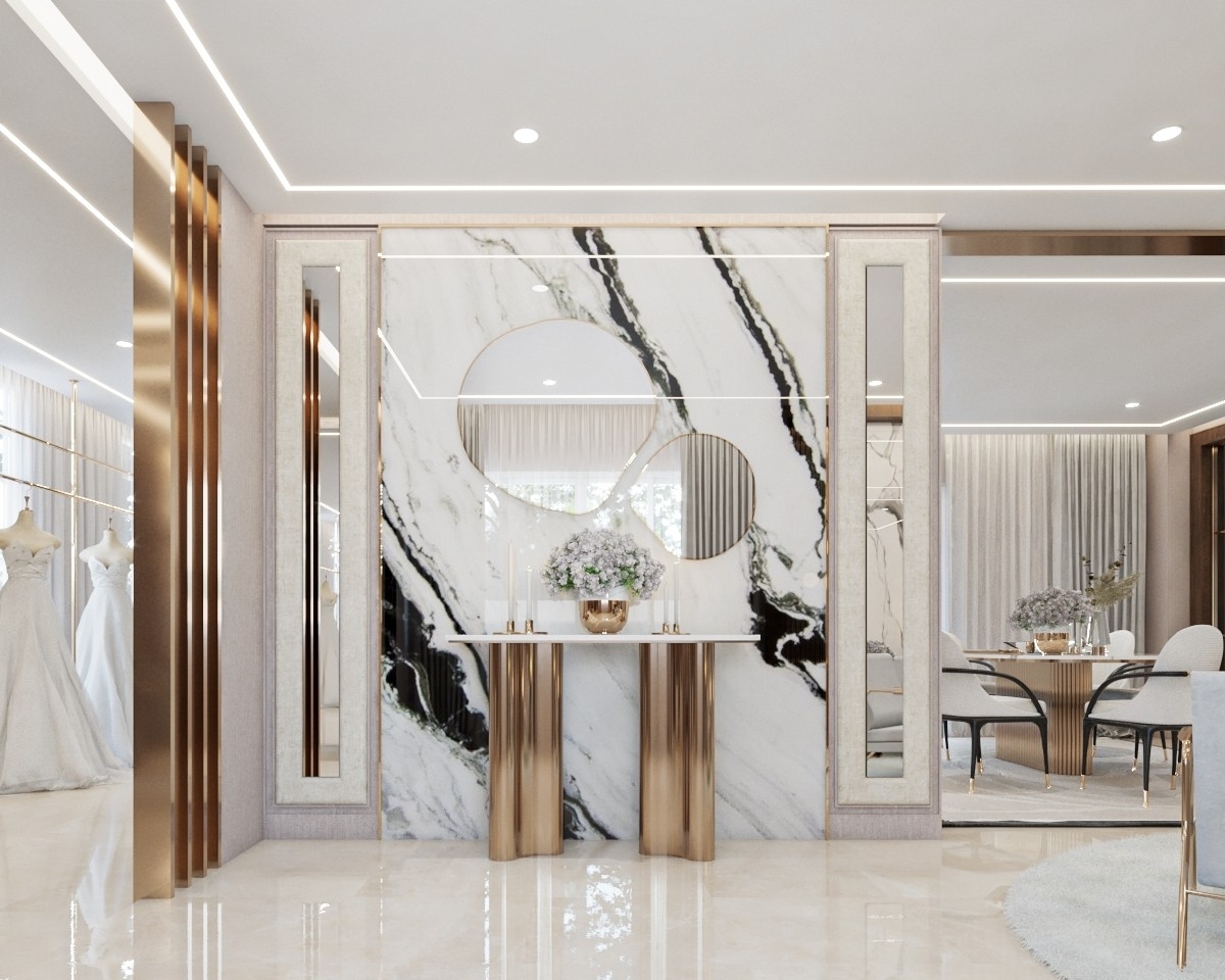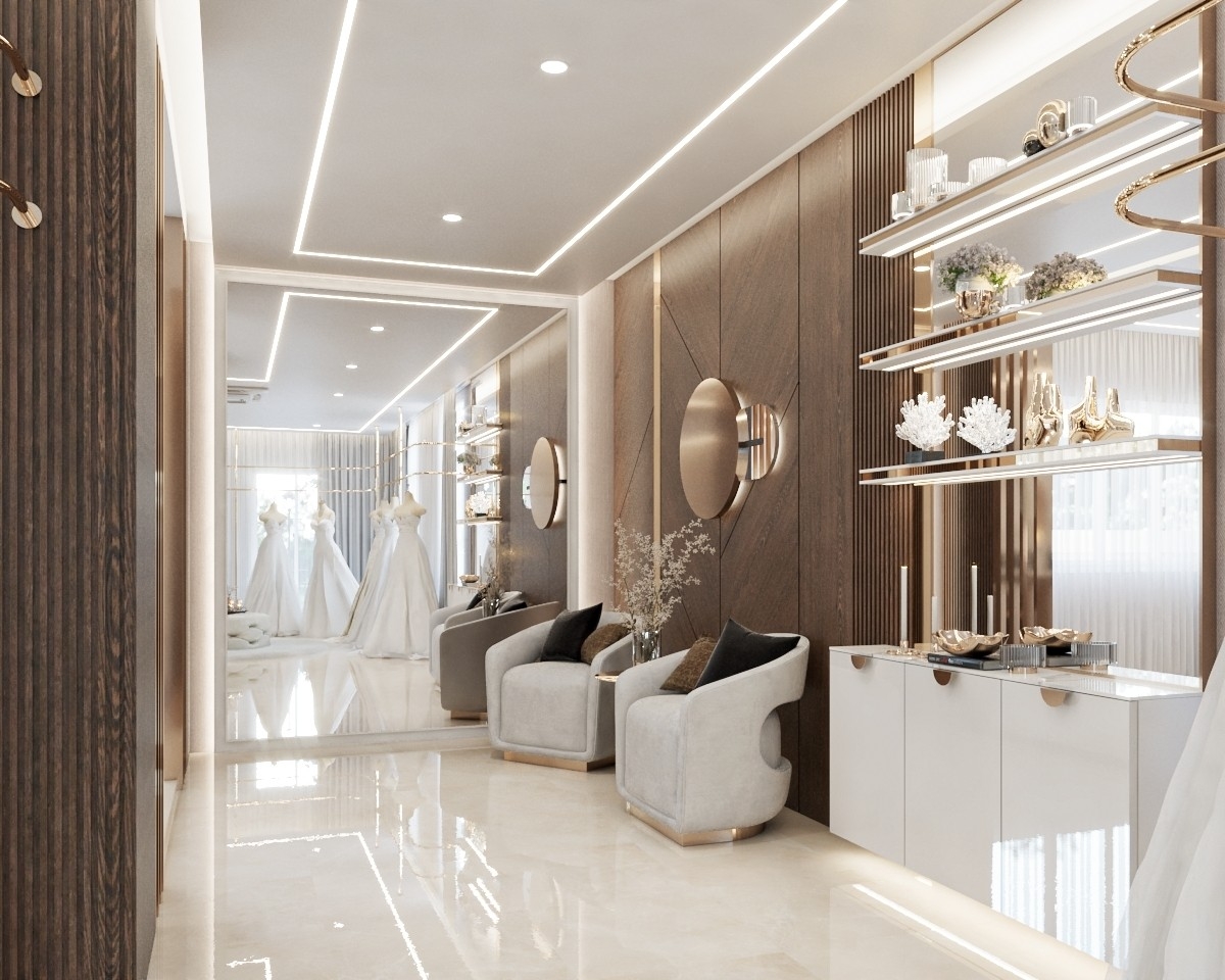โครงการนี้เป็นการออกแบบและตกแต่งภายในร้านขายชุดแต่งงานในย่านพัฒนาการ กรุงเทพฯ โดยออกแบบในสไตล์ Modern Luxury เน้นความหรูหราและความเรียบหรู ในพื้นที่ 115 ตารางเมตร โดยใช้วัสดุที่มีคุณภาพสูงและสีโทนที่สร้างบรรยากาศที่หรูหรา เช่น สีทอง สีขาว และสีดำ เพื่อสร้างความประทับใจให้กับลูกค้าที่มาใช้บริการ