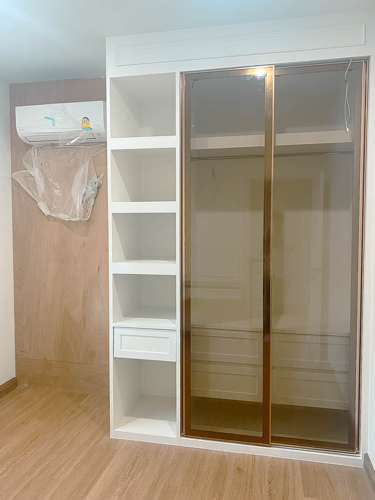 ห้องนอน: ตู้เสื้อผ้าบิ้วท์อินที่มีการจัดสรรพื้นที่เก็บของอย่างชาญฉลาด เพิ่มฟังก์ชันการใช้งานด้วยลิ้นชักและชั้นสำหรับวางของใช้ส่วนตัว