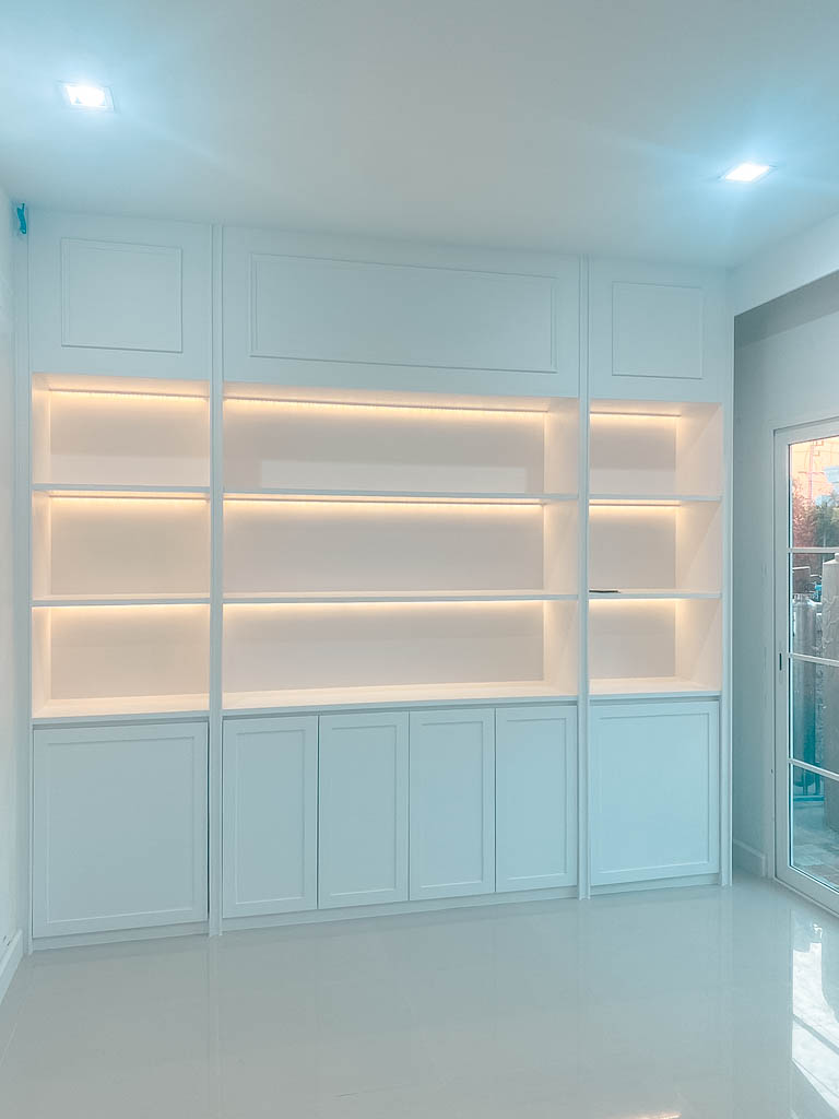 ห้องนั่งเล่น: ตู้บิ้วท์อินสำหรับวางทีวี พร้อมชั้นวางเปิดและช่องเก็บของที่ซ่อนอยู่ เพิ่มพื้นที่การจัดเก็บโดยไม่กระทบความเรียบง่ายของดีไซน์