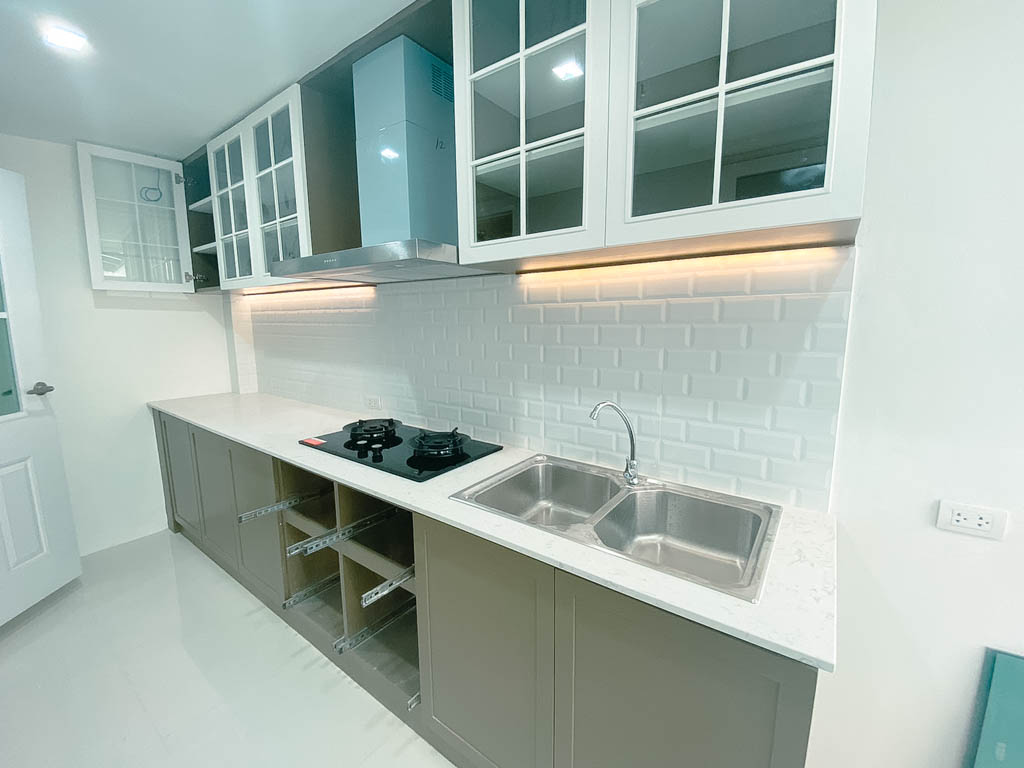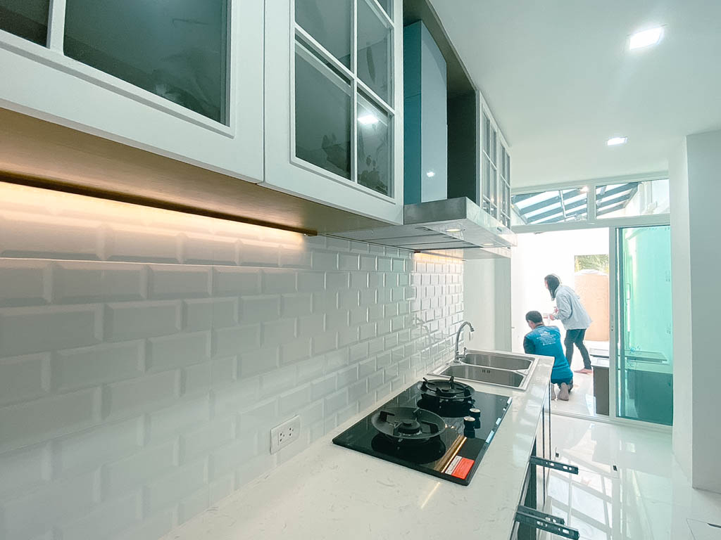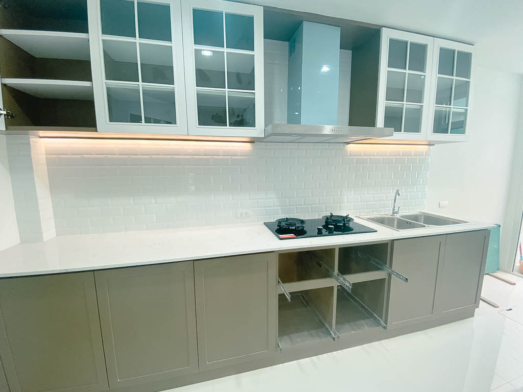 ห้องครัว: ชุดครัวบิ้วท์อินที่ออกแบบตามขนาดพื้นที่ พร้อมช่องเก็บอุปกรณ์ทำครัวที่ใช้งานสะดวกและง่ายต่อการทำความสะอาด