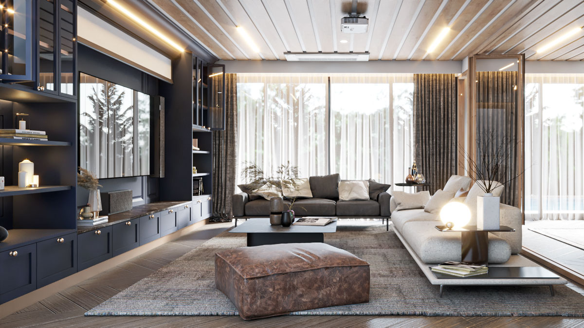 - ทีวีและตู้บิ้วท์อิน: ตู้ทีวีที่รวมฟังก์ชันจัดเก็บหนังสือ รีโมท และของใช้ในบ้าน พร้อมดีไซน์แบบเรียบหรู