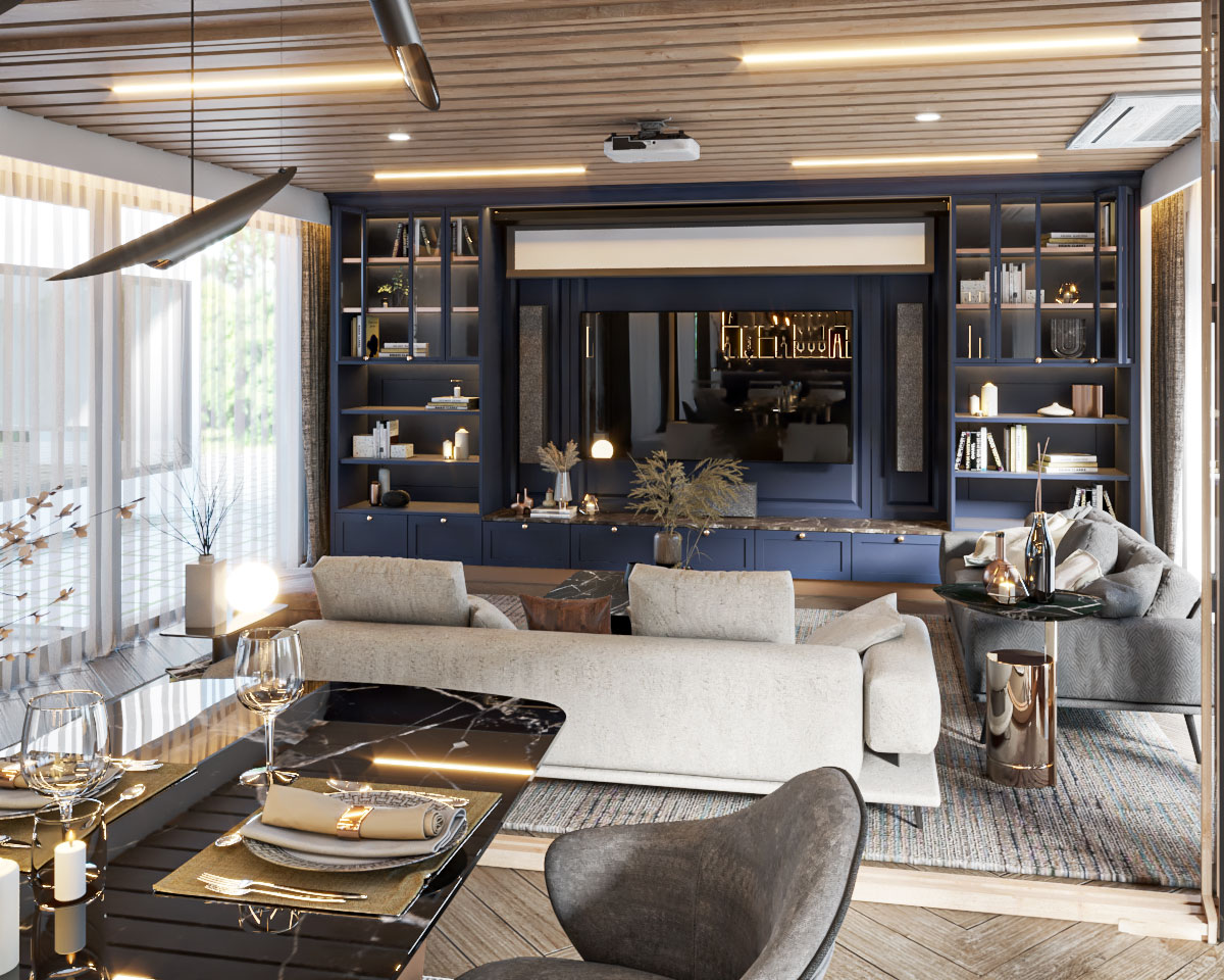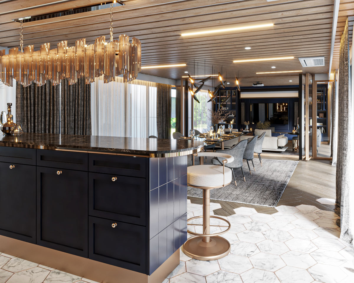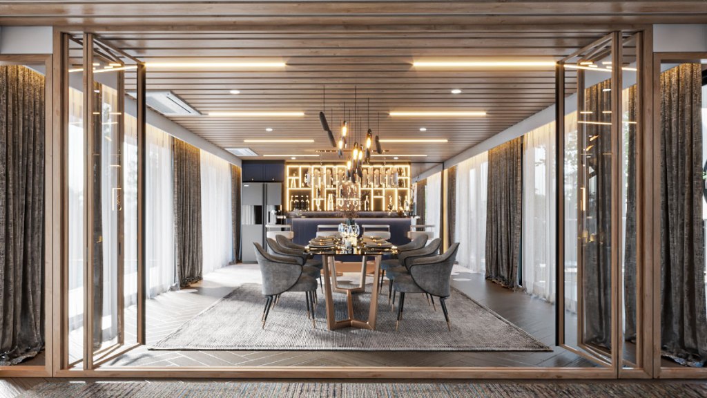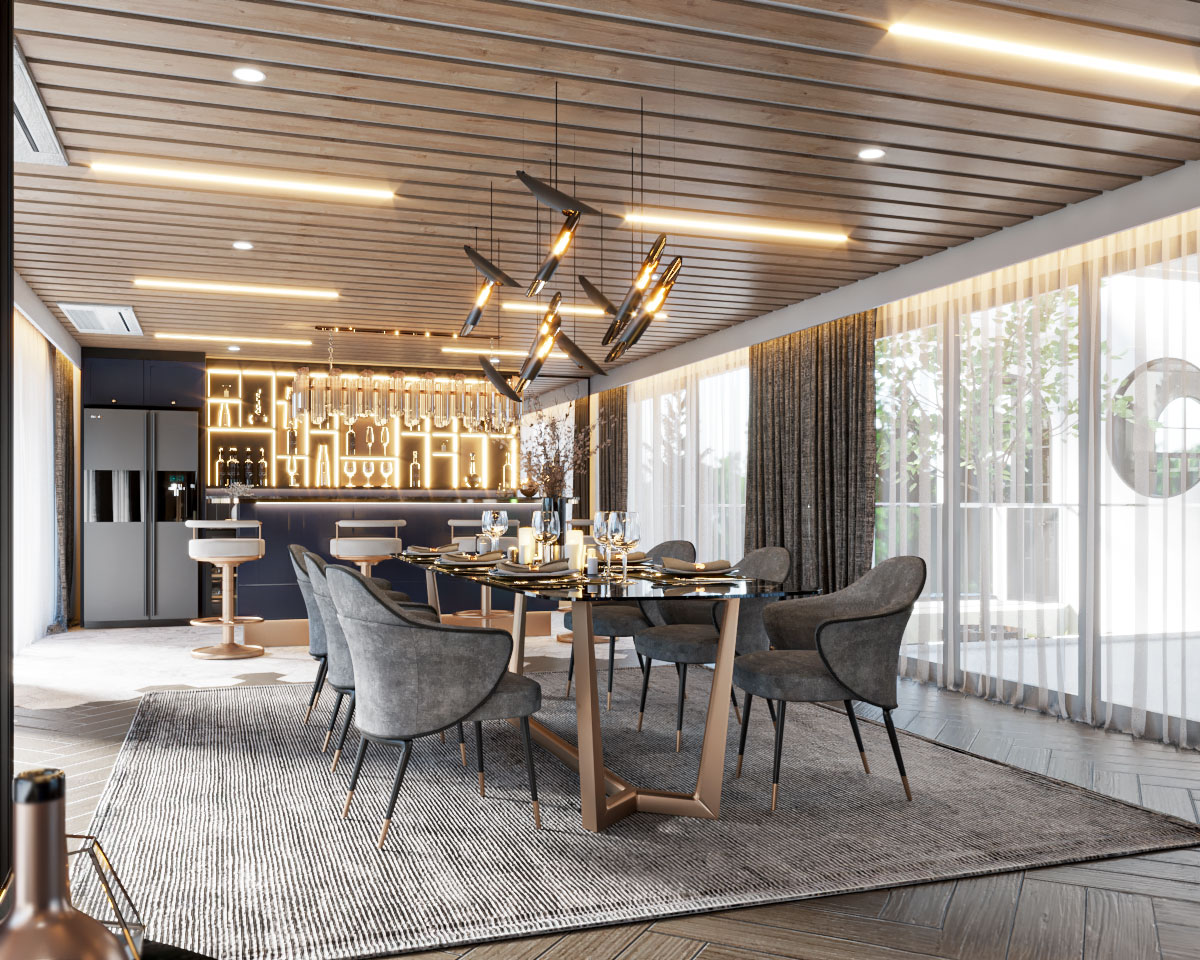 พื้นที่ Dining และ Family Room ได้รับการออกแบบให้เชื่อมโยงกันอย่างลงตัว เป็นพื้นที่ที่ผสมผสานระหว่างความหรูหราและความอบอุ่นของครอบครัว โซน Dining มอบบรรยากาศที่เหมาะสำหรับการรับประทานอาหารร่วมกัน ในขณะที่ Family Room เป็นพื้นที่พักผ่อนที่สะดวกสบายและตอบโจทย์ทุกการใช้งาน โครงการนี้สะท้อนถึงความเอาใจใส่ในทุกดีเทล เพื่อสร้างพื้นที่ที่ทั้งสวยงามและใช้งานได้จริง
