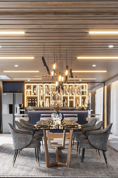 - โต๊ะอาหาร: ใช้โต๊ะหินอ่อนขนาด 6-8 ที่นั่ง พร้อมเก้าอี้บุนวมนุ่มในโทนสีอบอุ่นที่เข้ากับบรรยากาศหรูหรา