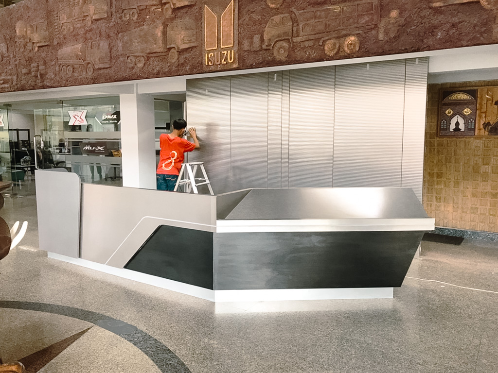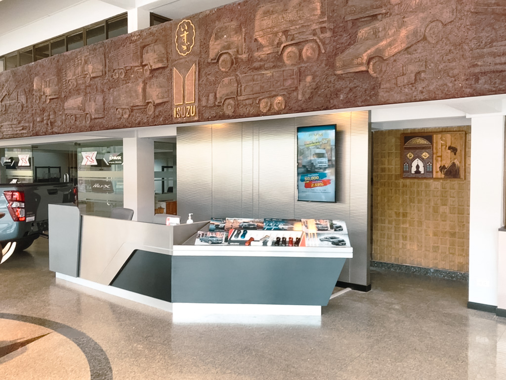 - ผนังด้านหลังเคาน์เตอร์ตกแต่งด้วยโลโก้แบรนด์ ISUZU เพื่อเพิ่มความโดดเด่น
