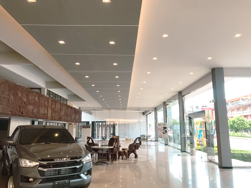 - ฝ้าหลุมดีไซน์เรียบง่ายในโซนโชว์รูม พร้อมไฟซ่อนช่วยเพิ่มมิติให้พื้นที่