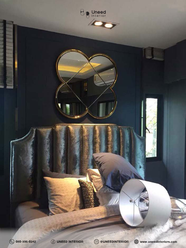 - ผนังหัวเตียง: ตกแต่งด้วยแผ่นไม้และกรอบเมทัลลิกทอง เพื่อเพิ่มความอบอุ่นและหรูหรา