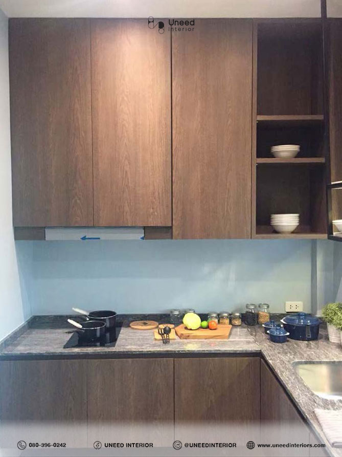 - ชุดครัวบิ้วท์อิน: ออกแบบพื้นที่เก็บของทั้งแบบเปิดและปิดเพื่อความเป็นระเบียบ วัสดุทนความชื้นและรอยขีดข่วน