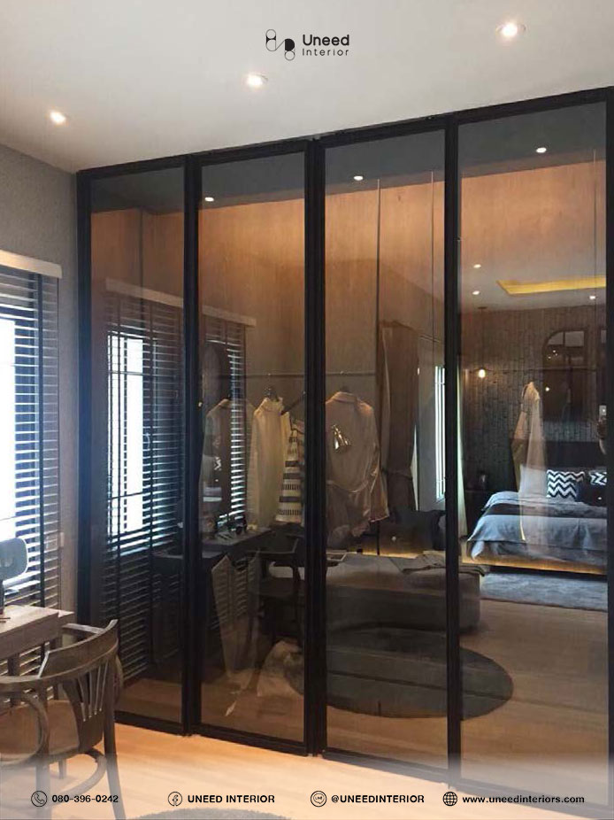 - ตู้เสื้อผ้าบิ้วท์อิน: ตู้เสื้อผ้าแบบบานเลื่อนพร้อมฟังก์ชันจัดเก็บหลากหลาย ทั้งลิ้นชัก ราวแขวน และช่องเก็บรองเท้า
